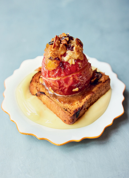 Ingredients: 4 apples, 25 g dried fruit, 25 g ginger, 25 g almonds, 25 g sugar, 50 g butter, 4 slices brioche, custard