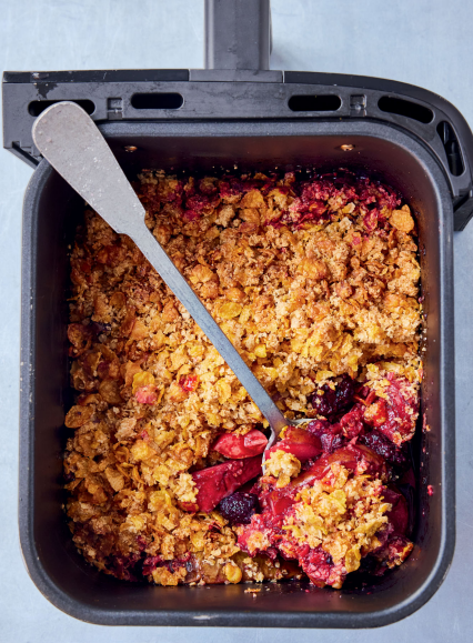 Instructions: Air fry fruit + ginger 40 min @ 180 °C; mix oats + butter + sugar + cornflakes; top fruit, air fry 10 min; serve warm.