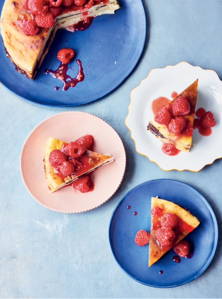 Instructions: Beat cheese + sugar + eggs + flour; layer mix + chocolate; air fry in 18 cm tin 24 min @ 200 °C; cool; serve with raspberry-orange sauce.