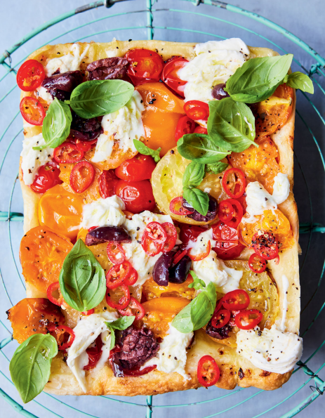 Golden puff pastry topped with soft roasted tomatoes, fresh basil, and gooey mozzarella this tart tastes like sunshine baked into flaky layers. The olives and chilli bring a little kick that makes it unforgettable.