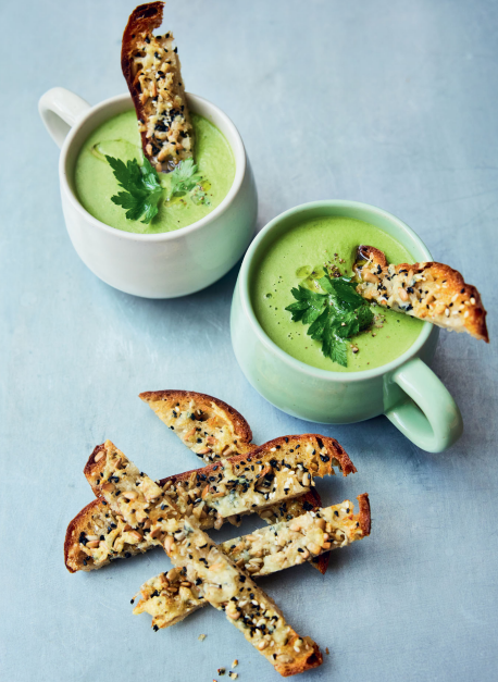 Instructions: Roast broccoli + onions 15 min @ 200 °C; toast seeded cheesy bread 7 min @ 180 °C; blend broccoli + cheese + stock + water + parsley; reheat 5 min; serve with crunchy soldiers.