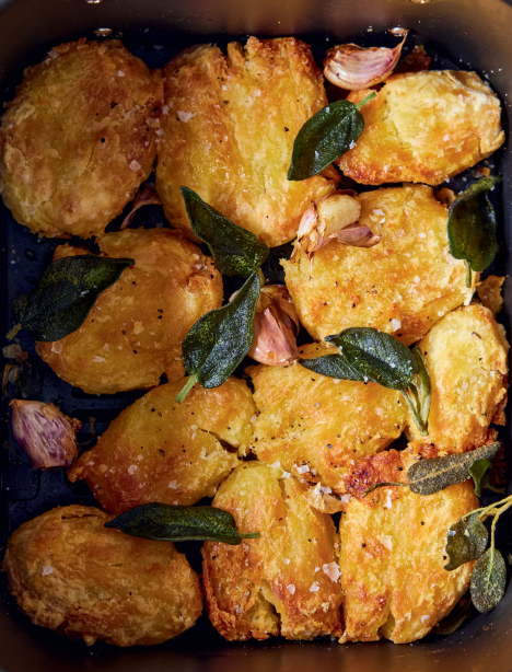 Instructions: Parboil 15 min, shake to rough edges; toss with butter, garlic, oil, salt; air fry 30 min @ 180 °C; crush slightly, add sage, cook 15 min more until crisp and golden.