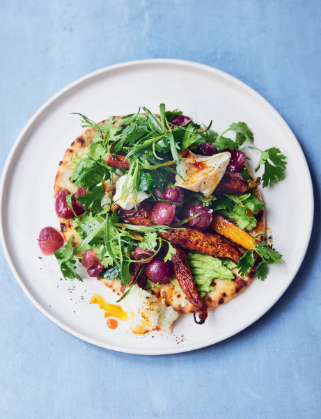Sweet roasted carrots meet warm goat’s cheese, juicy grapes, and avocado on toasted flatbreads. The harissa dressing adds heat, while herbs and vinegar keep it bright.