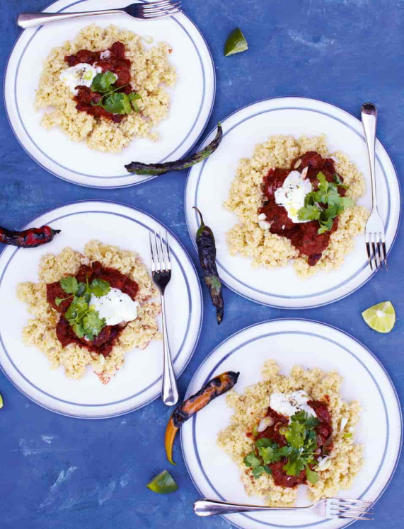- Ratatouille: 1 courgette, 1 small aubergine, 2 mixed-colour peppers, 1 red onion, 1 heaped tsp harissa, 2 anchovy fillets, 2–4 cloves of garlic, 700g passata, 1 tbsp balsamic vinegar, ½ a bunch of fresh basil, 2 tbsp fat-free natural yoghurt.