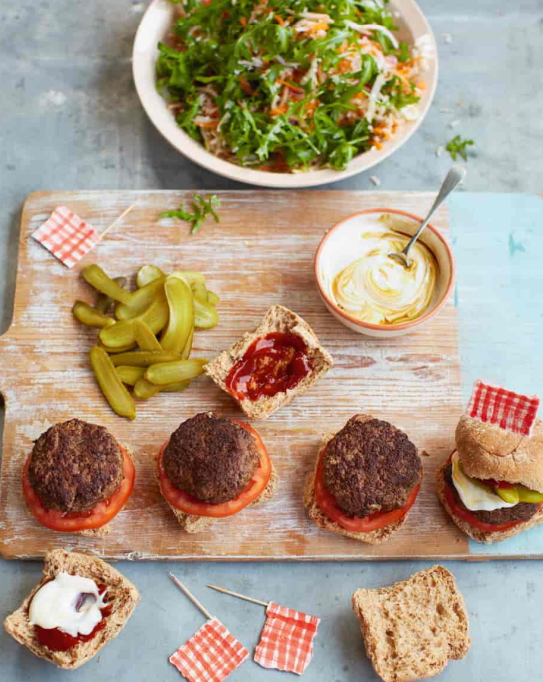 - To serve, slice the warm baps, spread with ketchup, and top with a tomato slice and a burger. Let everyone build their own burger at the table with the salad, pickles, and yoghurt sauce.