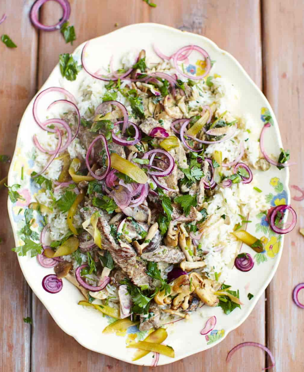 A rich and creamy beef stroganoff made with tender sirloin steak and mushrooms, served over fluffy rice with a tangy red onion and parsley pickle.