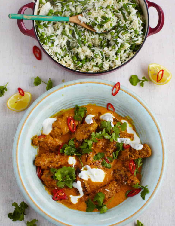 - Serve the curry scattered with the remaining fresh chilli and coriander, a dollop of yoghurt, and lemon wedges, with the rice and poppadoms on the side.