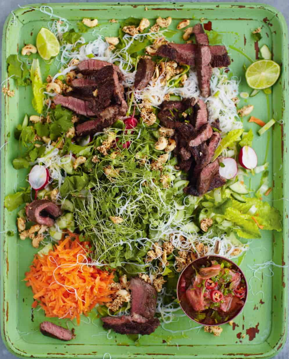- Slice the cooked steak. Serve the noodles in bowls, topped with the steak, mushrooms, fresh lettuce, radishes, and cress. Sprinkle with the toasted nuts and seeds and serve with lime wedges.