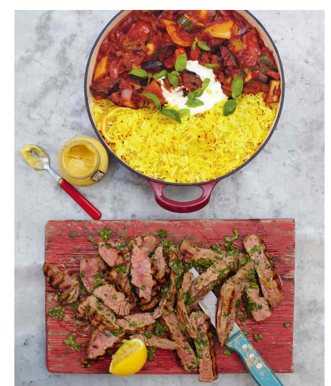 A taste of the Mediterranean with a juicy grilled sirloin steak served alongside a quick and hearty ratatouille and fragrant saffron rice.