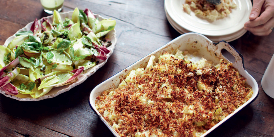 - Serve: Serve the hot cauliflower macaroni with extra Parmesan shaved over the top. Take the fruit out of the oven. Serve the chicory salad with the dressing and crispy capers. For dessert, serve the stewed fruit layered with vanilla ice cream.
