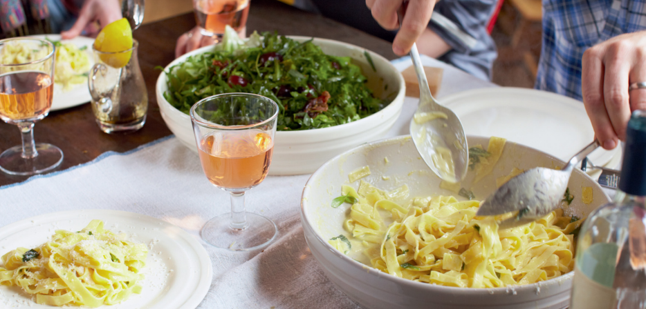 - Serve: Serve the pasta in a big bowl with grated Parmesan and fresh basil on top. Serve the salad with olive oil and lemon wedges. Enjoy the warm tarts with a spoonful of crème fraîche for dessert.