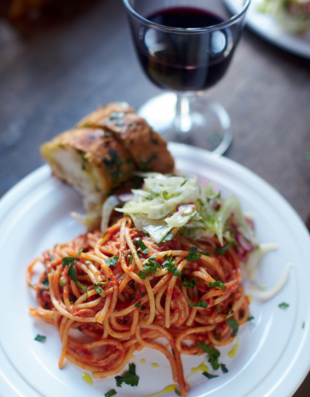- Serve: Serve the pasta on a large platter with the remaining parsley on top. Serve with the warm garlic bread and the crunchy salad. Enjoy the chocolate ganache for dessert.